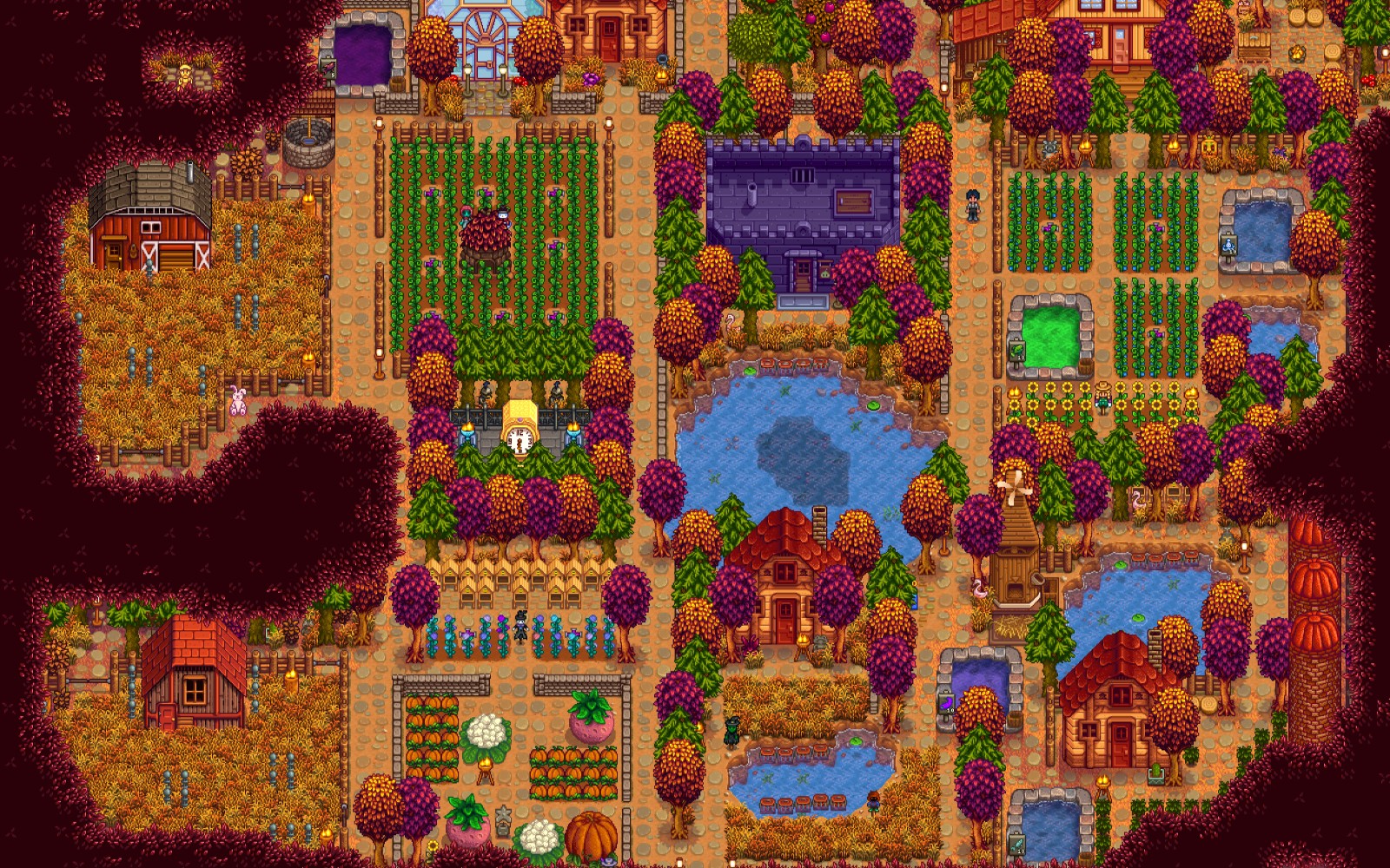 从自己的农场出发,沿着北方的道路前进,穿过位于市区北边的社区中心,继续向西北方向行走。你将会穿越布满野花和密布着野生植物的草地。