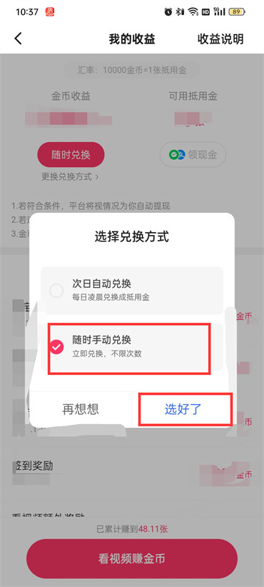 4.最后在页面中弹出的对话框中选择【随时手动兑换】之后点击【选好了】即可;