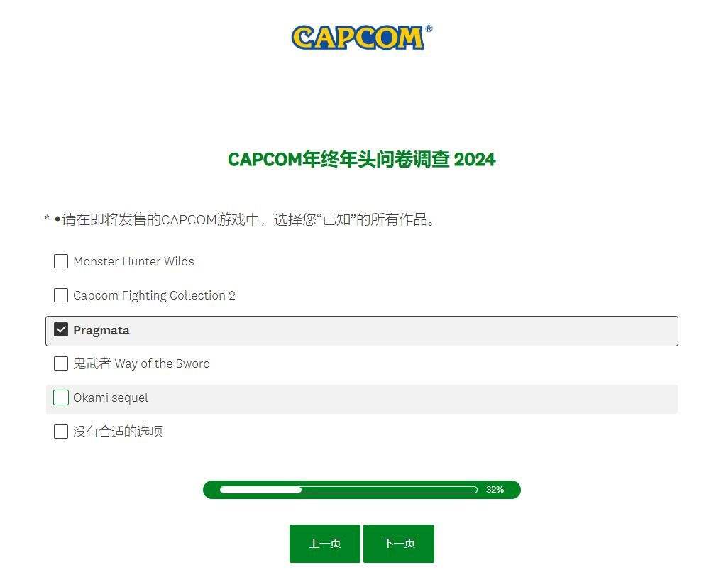 问卷本身内容平平无奇,是正常的市场调研。然而其中有处问题是“请在即将发售的CAPCOM游戏中,选择您已知的所有作品”,候选项除了《怪物猎人:荒野》、《鬼武者Way of the Sword》外,还包含了《Pragmata》这款跳票多年的神秘游戏。