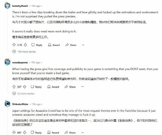 同时,也有玩家针对《刺客信条:影》先前发布的预告片提出了技术层面的质疑,批评其动画效果与环境渲染不尽如人意,并指出已有多个视频分析揭示了游戏中可能存在的Bug与性能问题,暗示这些技术问题可能是导致延期的主要原因。