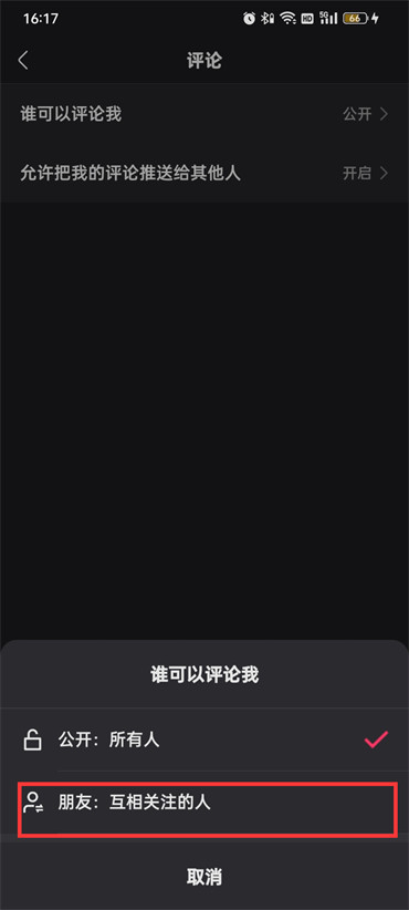 6.点击过后在页面下面弹出的选择项中点击【朋友:互相关注的人】即可;