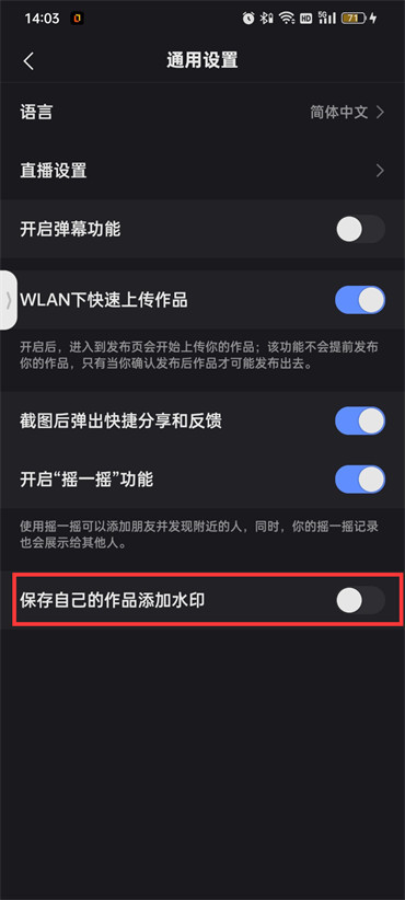4.最后来到通用设置的页面中点击关闭【保存自己的作品添加水印】即可;