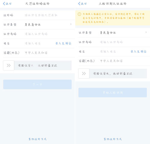 人脸识别认证注册:人脸识别认证注册需要身份证件、姓名、地区、以及人脸识别