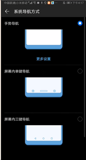 2、选择手势导航时,返回上一级只需从屏幕左边或者右边向内滑动即可;