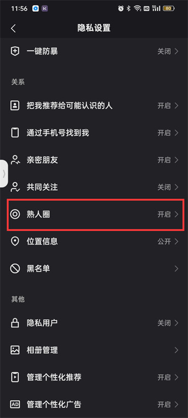 4.来到隐私设置的页面之后点击【熟人圈】;