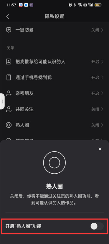 5.最后在页面下面淌出的对话框中关闭【熟人圈】即可;