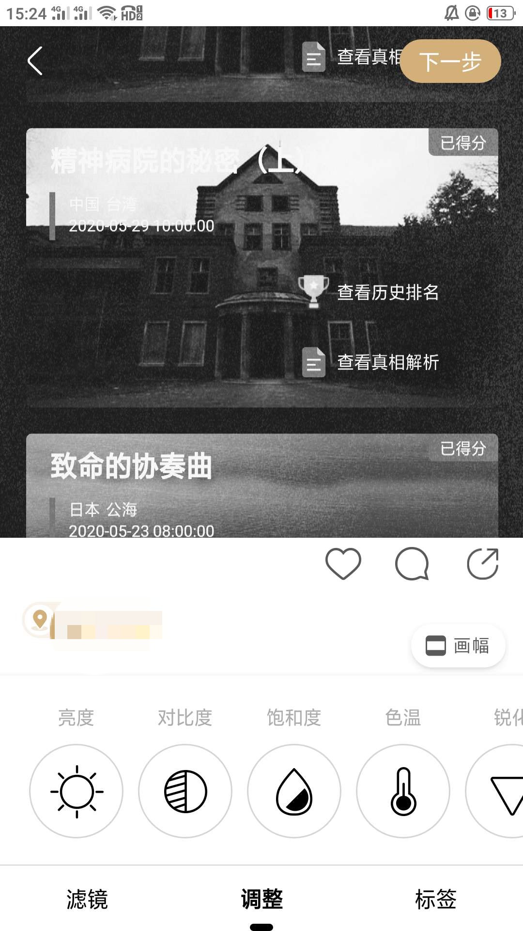 5、在发布动态界面中调整选项中可以对一些参数进行微调,包括亮度、对比度、饱和度等。功能算是够用,但使用体验离成熟的图片处理App还有差距,缺少上一步撤销、恢复按钮,没有对比原图的功能。希望可以在后续版本中尽快跟进。