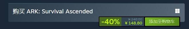 目前,《方舟:生存飞升》正参与Steam冬季特卖活动,享受40%的折扣优惠,国区折后价为148.8元人民币,创下历史新低。