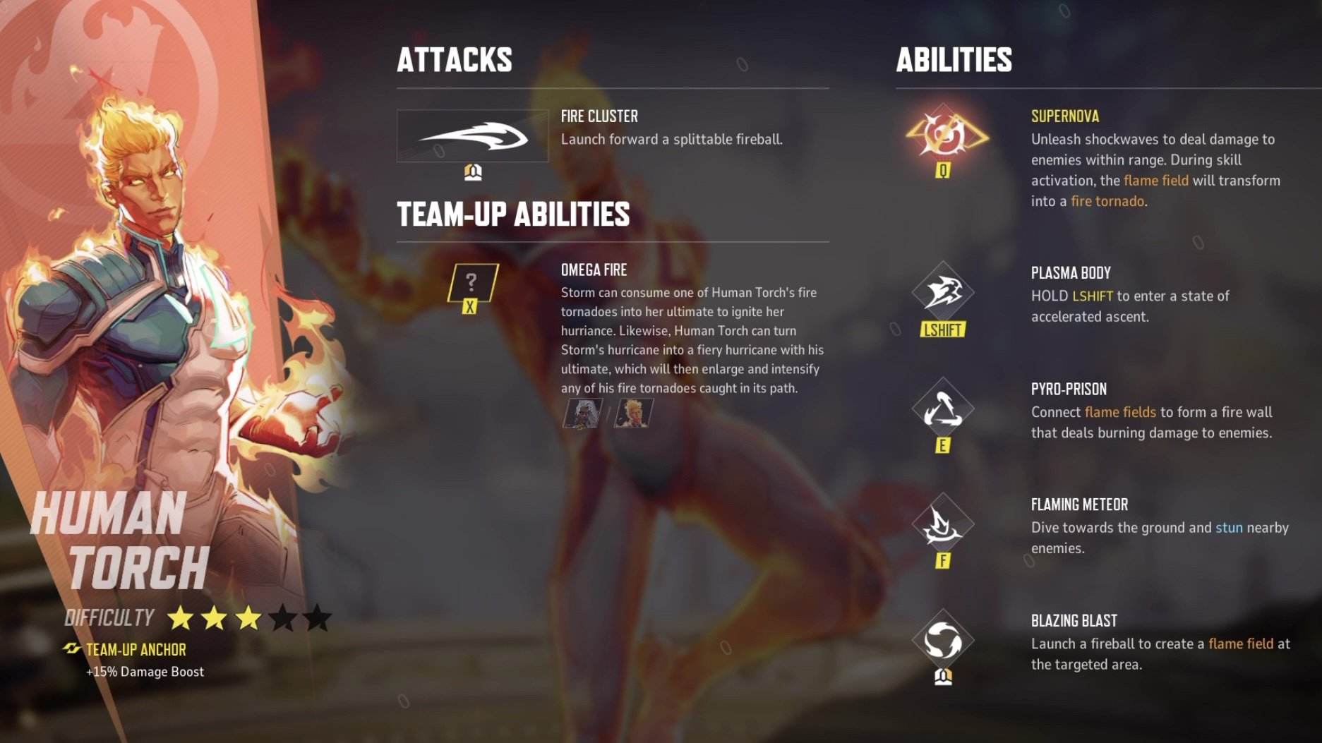 据泄密信息,霹雳火在游戏中将扮演一名区域控制型角色,其技能包括火球、炽热爆炸、超新星、等离子化、火焰牢狱以及火焰流星。尤为引人注目的是,他还将与X战警中的暴风女携手,共同施展名为“欧米茄火焰”的联合技能。