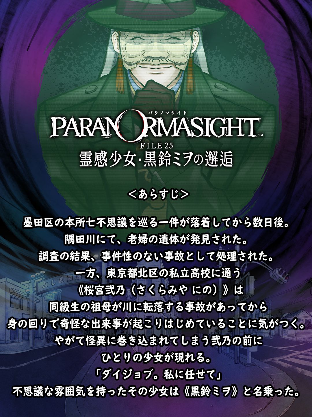 《PARANORMASIGHT:本所七大不可思议》以昭和后期的日本墨田区为舞台,游戏采用360度全景背景,在墨田区的观光课、乡土资料馆、观光协会和商工会等单位的大力协助之下呈现最真实的街道风景,让人仿佛真的置身于昭和时期的日本。