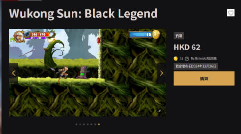 《黑神话:悟空》爆火之后,有不少的游戏都来跟风蹭热度,但是最离谱的还要属这款已经登陆了switcheShop商城的2D平台冒险游戏《悟空传:黑暗传奇(Wukong Sun: Black Legend)》,游戏计划在12月26日发售,售价62港币(约合58元人民币)。