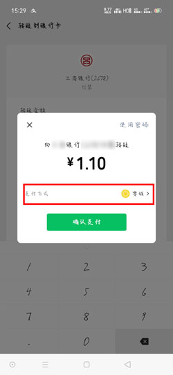 7、最后选择支付方式,点击【确认收款】之后,使用支付密码或者指纹支付即可,完成转入到银行卡操作。