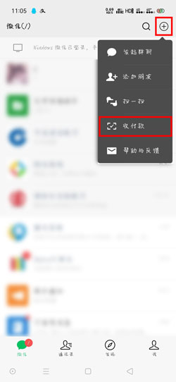 1、如果我们想要通过手机号码直接转账到绑定的微信中,需要对方开启“允许通过手机号向我转账”功能,打开微信,点击右上角的【 】,选择【收付款】;