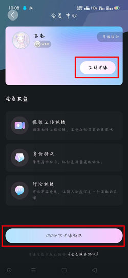 3、进入会员中心后,可以看到会员所拥有的权益,点击【立即开通】或者【100秘宝开通权限】,输入安全密码支付100秘宝购买权益。