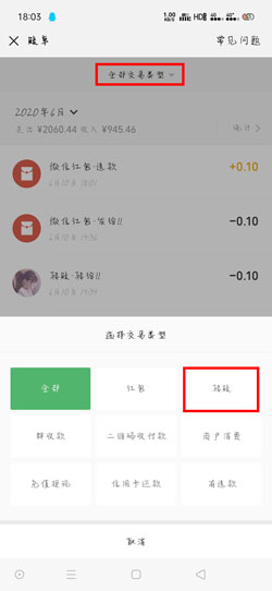 4、然后在最上方点击【全部交易类型】,选择【转账】,设置账单类型为转账;