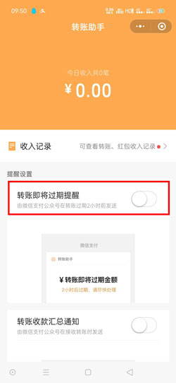 2、进入转账助手小程序之后,在提醒设置中,将【转账即将过期提醒】功能开启;