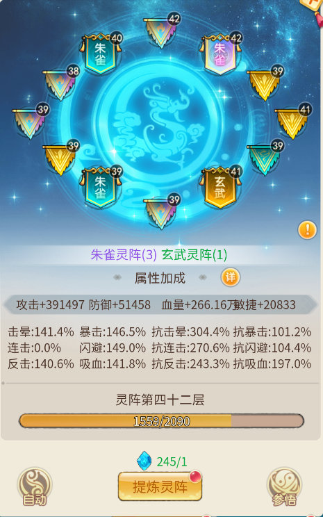 2.仙友的悟性越高,每次提炼阵法时,能获得稀有阵眼、阵枢的概率就越高。