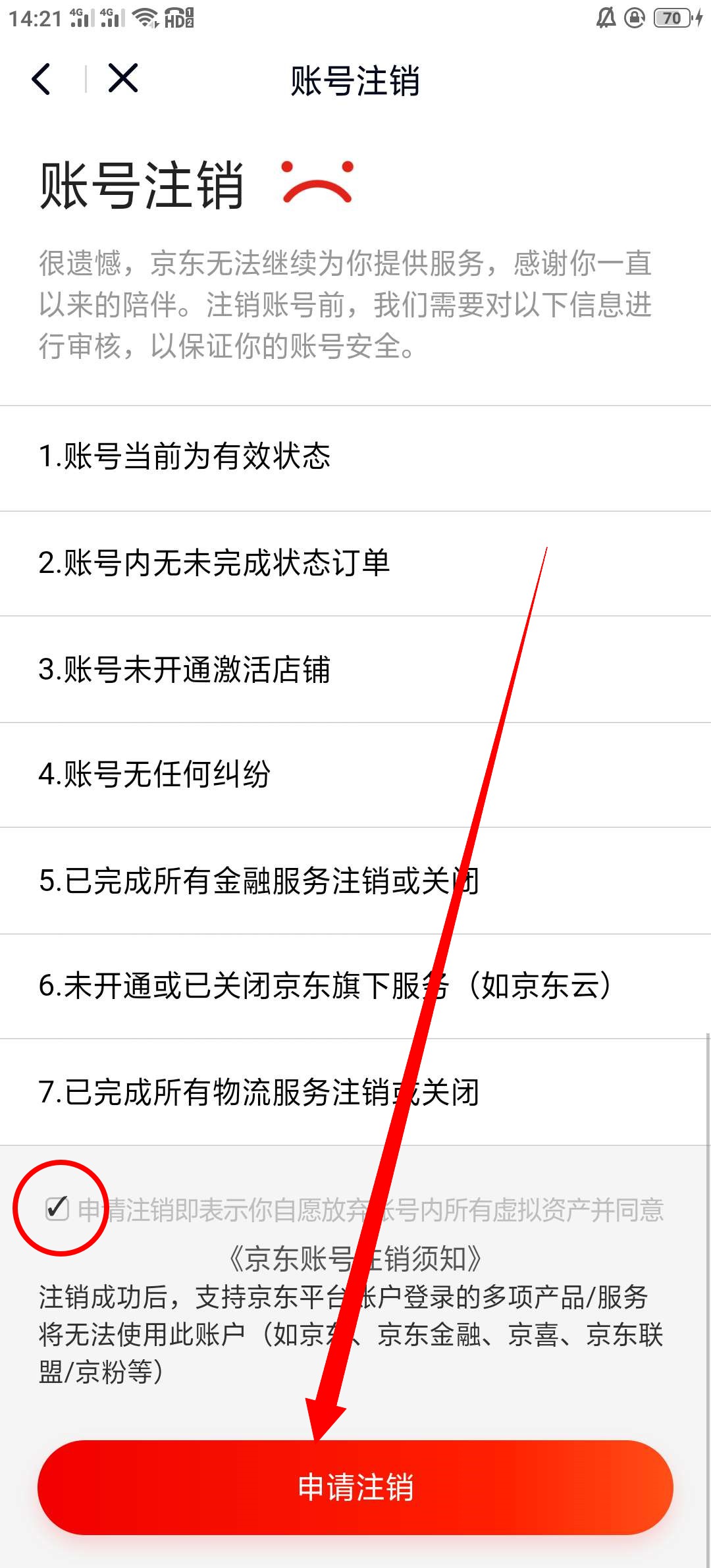 5、进入注销界面后,可以看到账号注销需要完成的东西,如果都没有就点击下方的申请注销。
