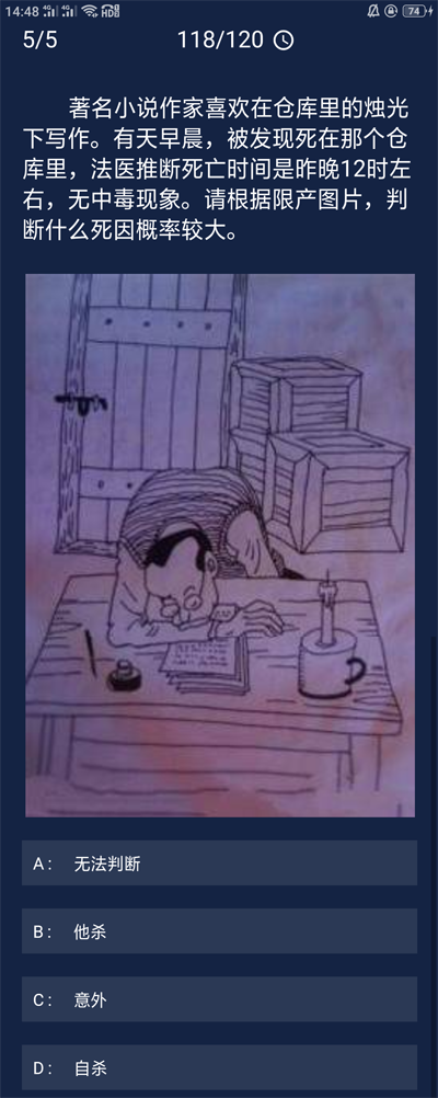 因为桌上的蜡烛并没有烧尽,桌面也很整齐,所以意外猝死的几率很小。无中毒现象,现场也没发现吊绳等工具,死者掐死自己活着憋死自己的概率更小。综合判断,他杀的可能性大- -点,凶手杀害死者后,吹灭了蜡烛(怕有人看到灯光前来,所以想营造出死者已睡觉的假象)。