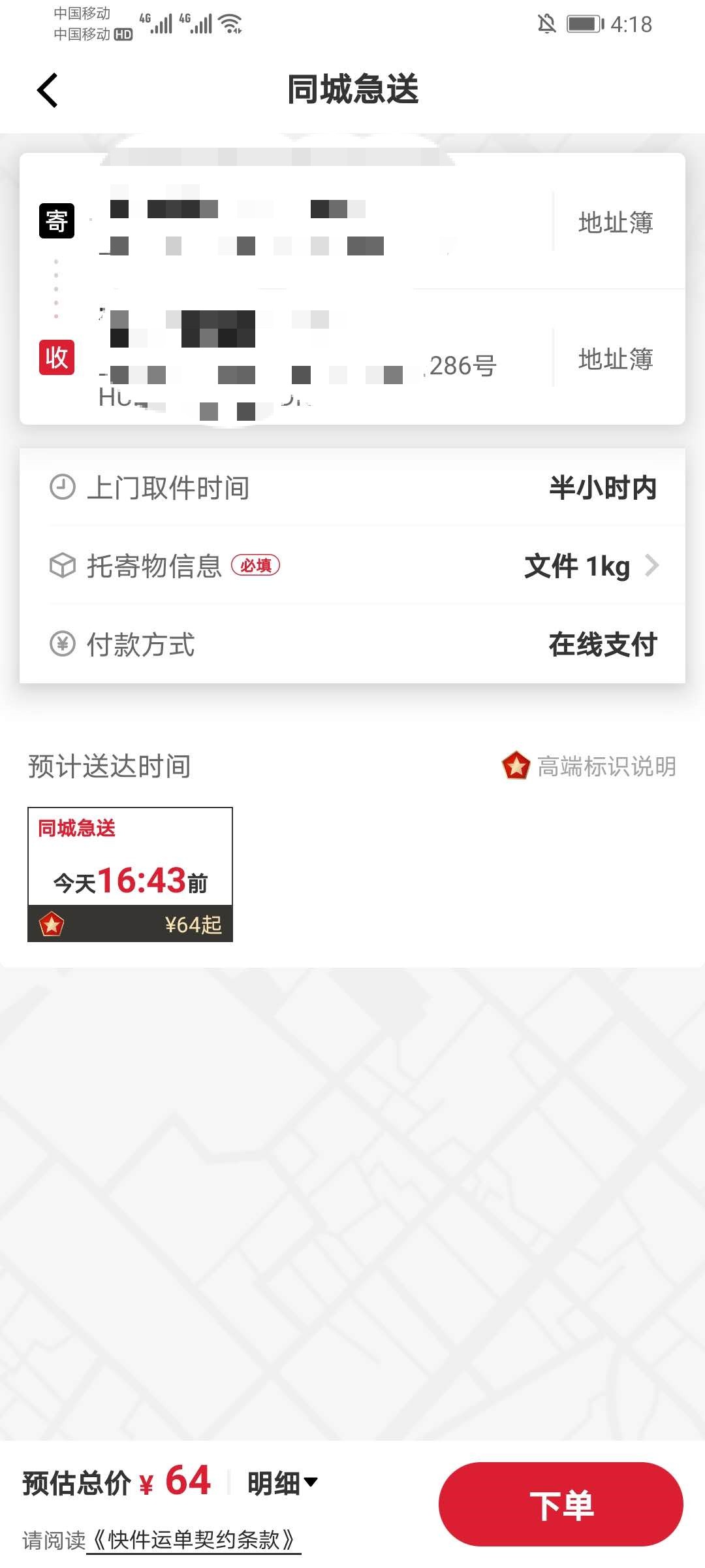 3、在同城急送界面中,填写好信息即可,点击下单等待快递员上门取件。