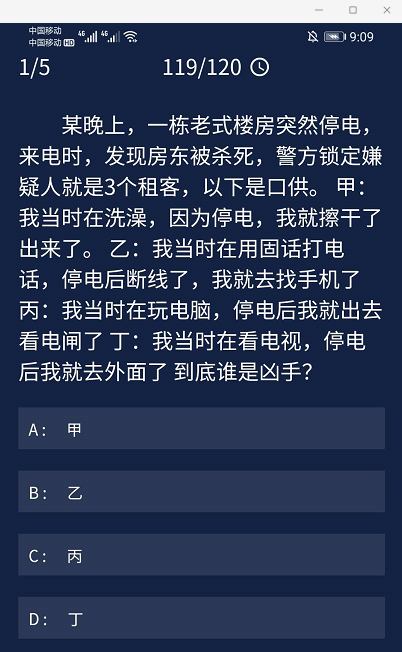 1、某晚上,一栋老式楼房突然停电,来电时,发现房东被杀死,警方锁定嫌疑人就是3个租客,以下是口供。甲:我当时在洗澡,因为停电,我就擦干了出来了。乙:我当时在用固话打电话,停电后断线了,我就去找手机了丙:我当时在玩电脑,停电后我就出去看电闸了丁:我当时在看电视,停电后我就去外面了到底谁是凶手?