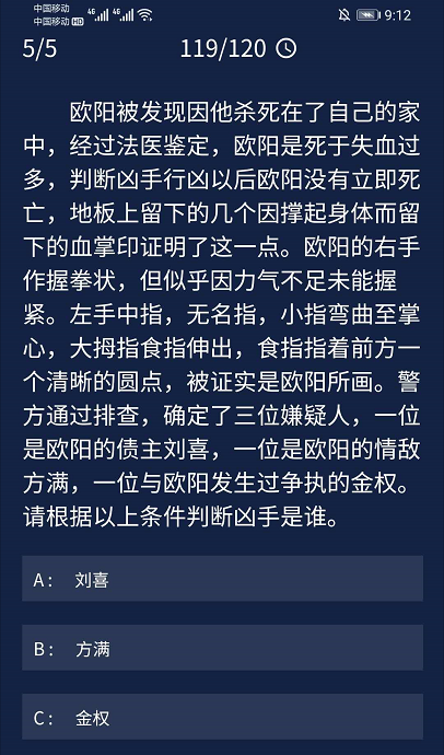 5、欧阳被发现因他杀死在了自己的家中,经过法医鉴定,欧阳是死于失血过多,判断凶手行凶以后欧阳没有立即死亡,地板.上留下的几个因撑起身体而留下的血掌印证明了这一点。欧阳的右手作握拳状,但似乎因力气不足未能握紧。左手中指,无名指,小指弯曲至掌心,大拇指食指伸出,食指指着前方个清晰的圆点,被证实是欧阳所画。警方通过排查,确定了三位嫌疑人,一位是欧阳的债主刘喜,一位是欧阳的情敌方满,一位与欧阳发生过争执的金权。请根据以上条件判断凶手是谁。