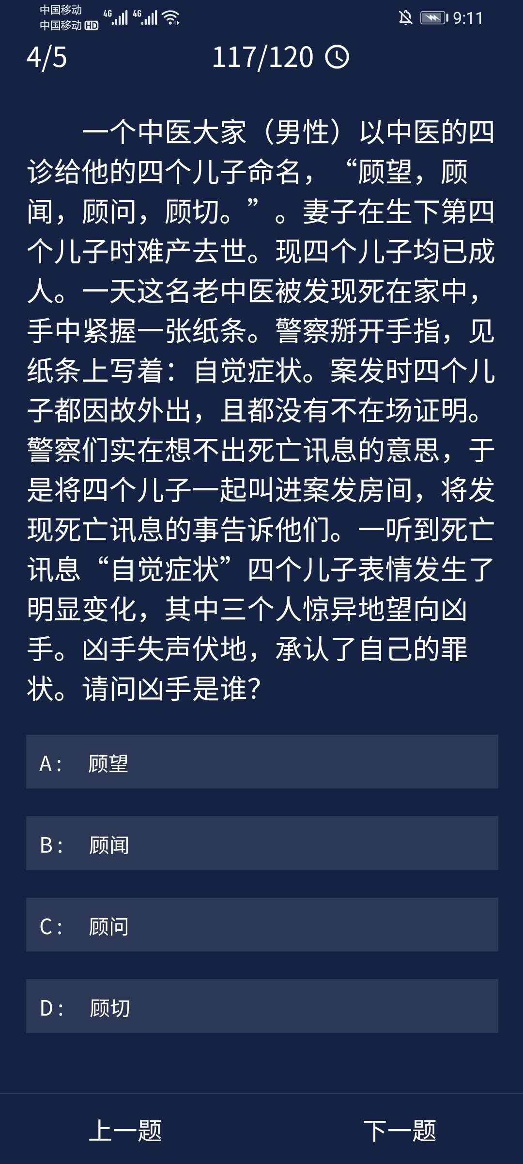 4、一个中医大家(男性)以中医的四诊给他的四个儿子命名,“顾望,顾闻,顾问,顾切。妻子在生下第四个儿子时难产去世。现四个儿子均已成人。一天这名老中医被发现死在家中,手中紧握一张纸条。警察掰开手指,见纸条上写着:自觉症状。案发时四个儿子都因故外出,且都没有不在场证明。警察们实在想不出死亡讯息的意思,于是将四个儿子一起叫进案发房间,将发现死亡讯息的事告诉他们。一听到死亡讯息‘自觉症状”四个儿子表情发生了明显变化,其中三个人惊异地望向凶手。凶手失声伏地,承认了自己的罪状。请问凶手是谁?