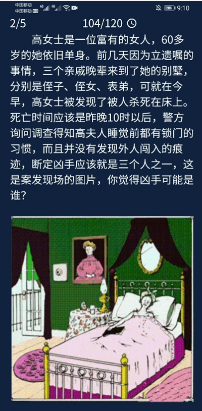 2、高女士是一位富有的女人,60多岁的她依旧单身。前几天因为立遗嘱的事情,三个亲戚晚辈来到了她的别墅,分别是侄子、侄女、表弟,可就在今早,高女士被发现了被人杀死在床上。死亡时间应该是昨晚10时以后,警方询问调查得知高夫人睡觉前都有锁门门的习惯,而且并没有发现外人闯入的痕迹,断定凶手应该就是三个人之一,这是案发现场的图片,你觉得凶手可能是谁?