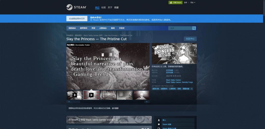 可以去Steam平台下载,地址是:https://store.steampowered.com/app/1989270/Slay_the_Princess__The_Pristine_Cut/。