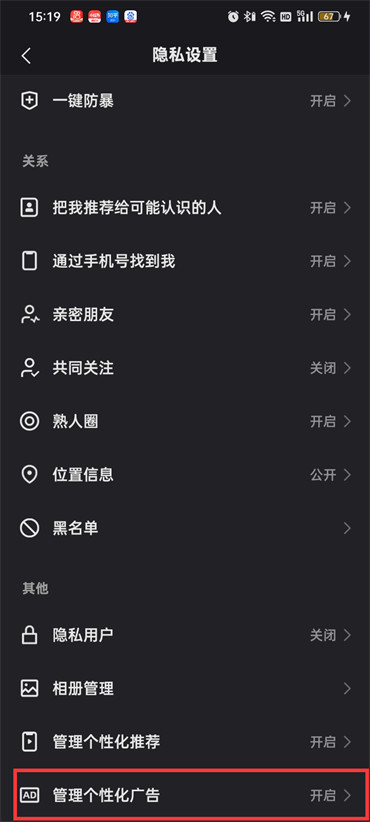 4.来到隐私设置的页面之后就可以看到【管理个性化推荐】即可设置;