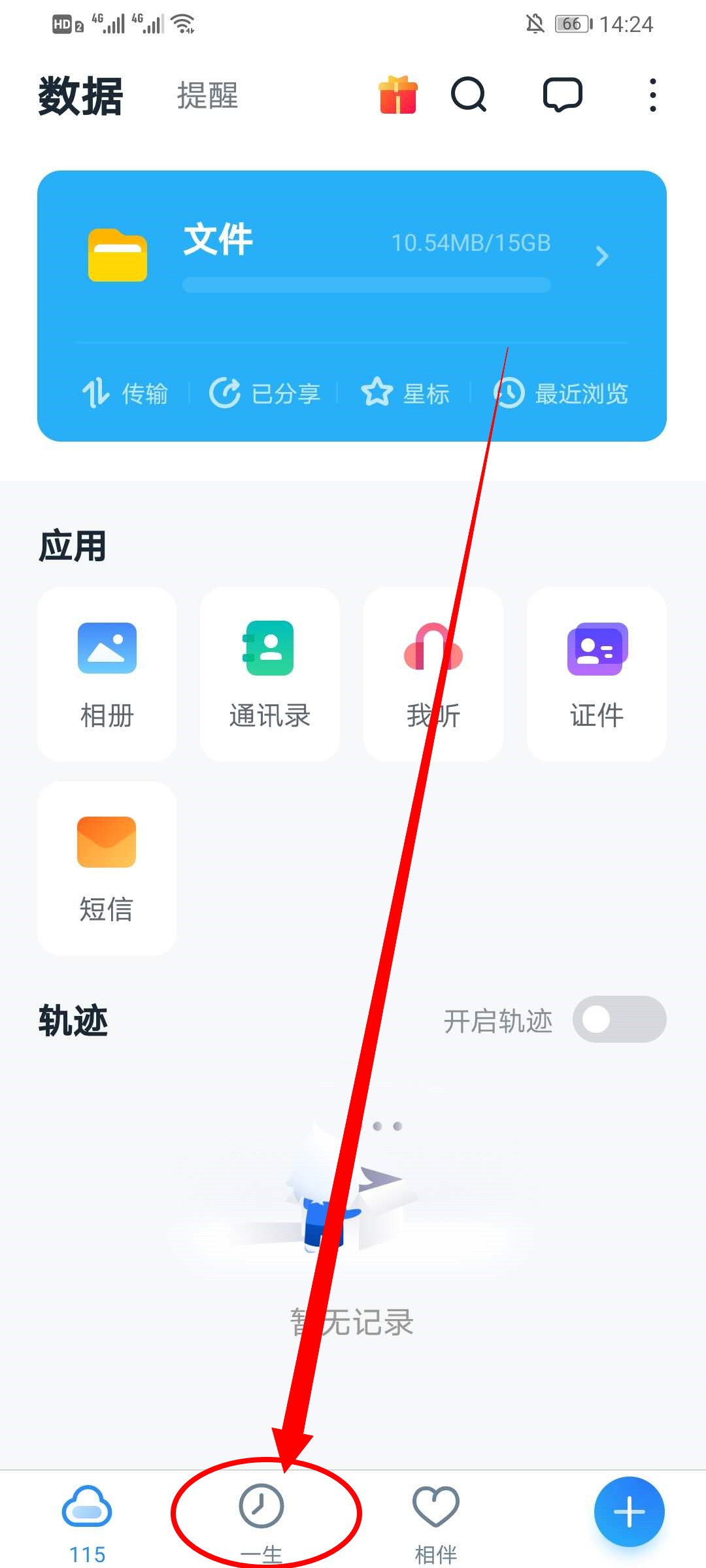 1、打开115网盘app,在首页点击下方的一生。