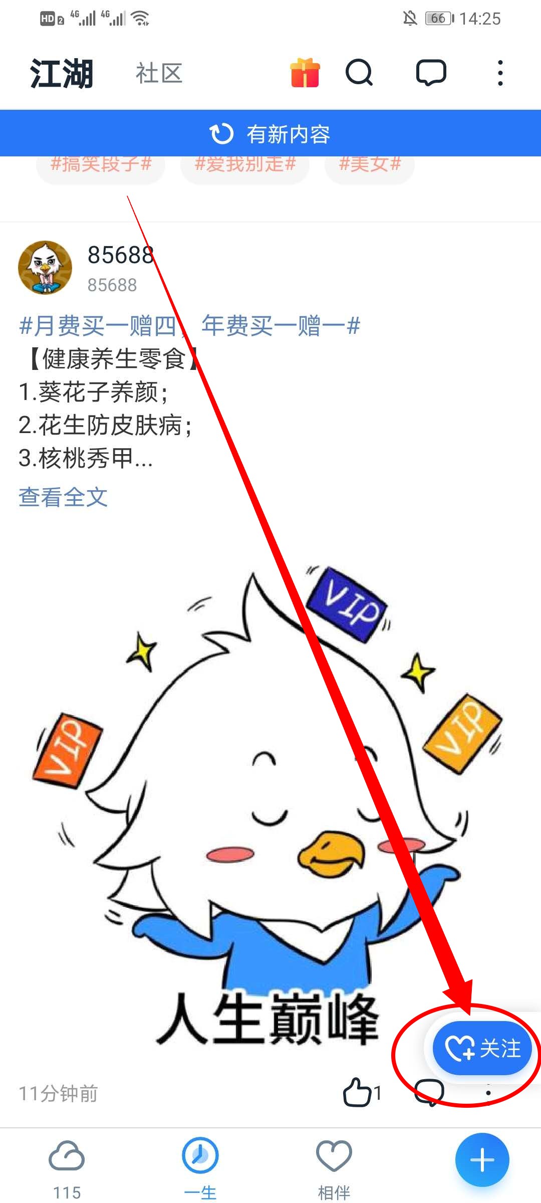 2、在一生界面中,点击右下方的关注。
