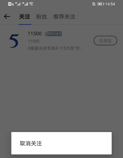 5、点击关注的人的后方的已关注,在弹出的选项中点击取消关注。