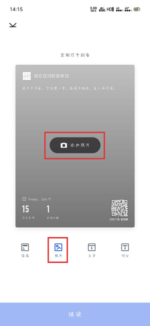 3.然后就可以从四种图片打卡方式中选择打卡的类型,因为我们需要自定义海报背景,所以选择【照片】,点击海报中间的【添加照片】;