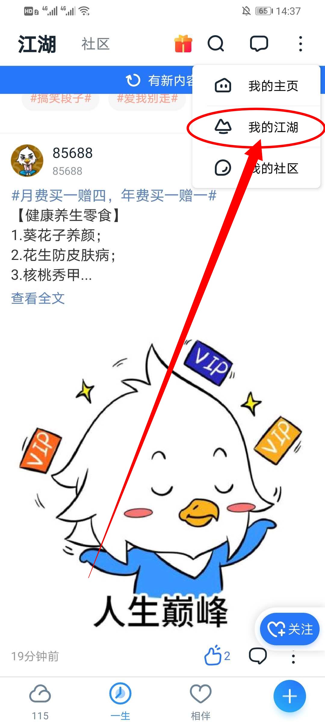 2、在一生界面点击右上角的省略号,在弹出的选项中点击我的江湖。