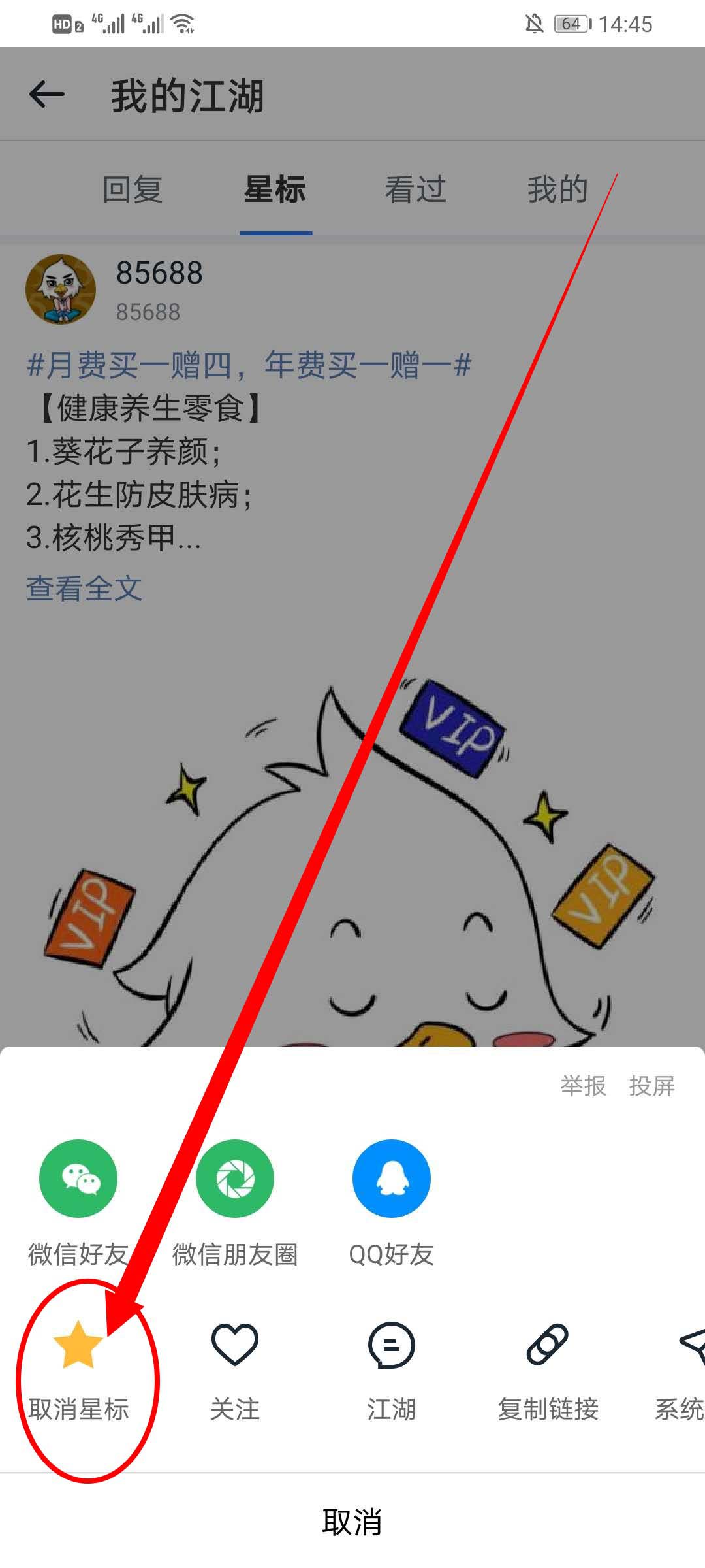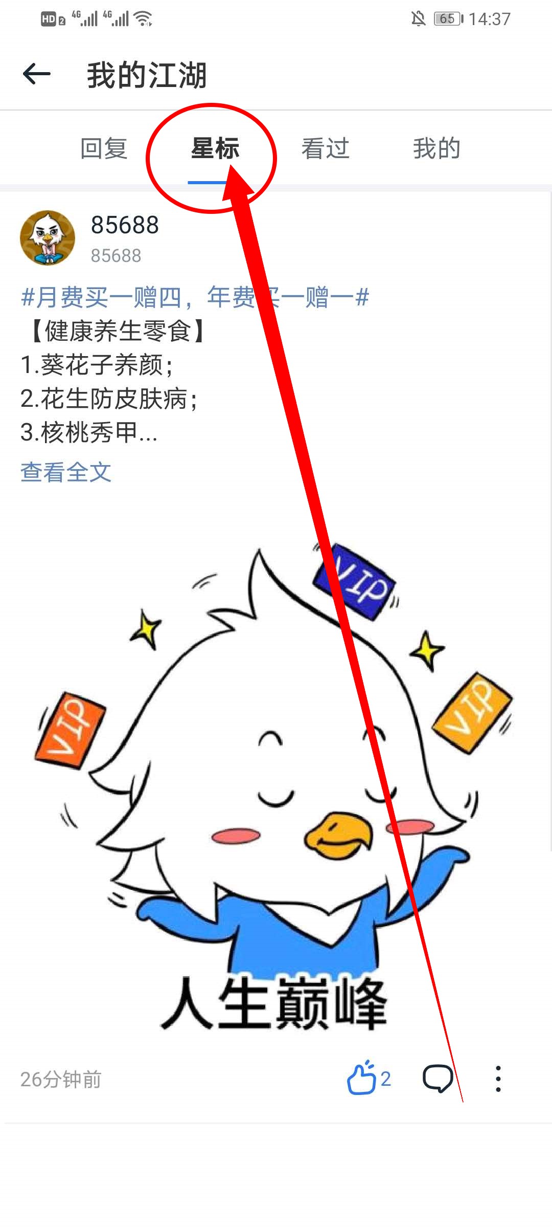 3、在我的江湖界面,点击星标可以查看到收藏的文章。