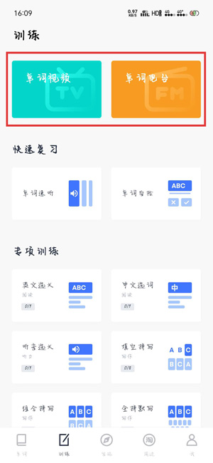 2.在下方的功能栏中选择【训练】,在最上方就可以看到单词视频和单词电台入口;