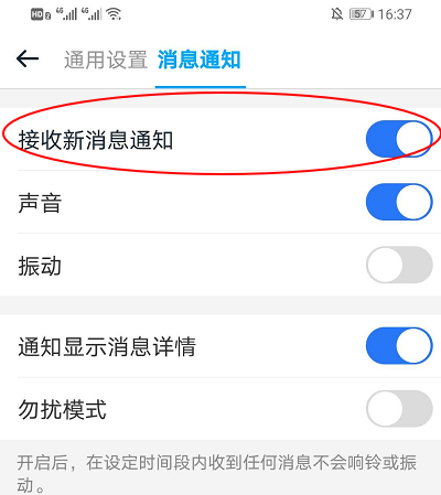4、在消息通知界面点击接受新消息通知关闭即可。