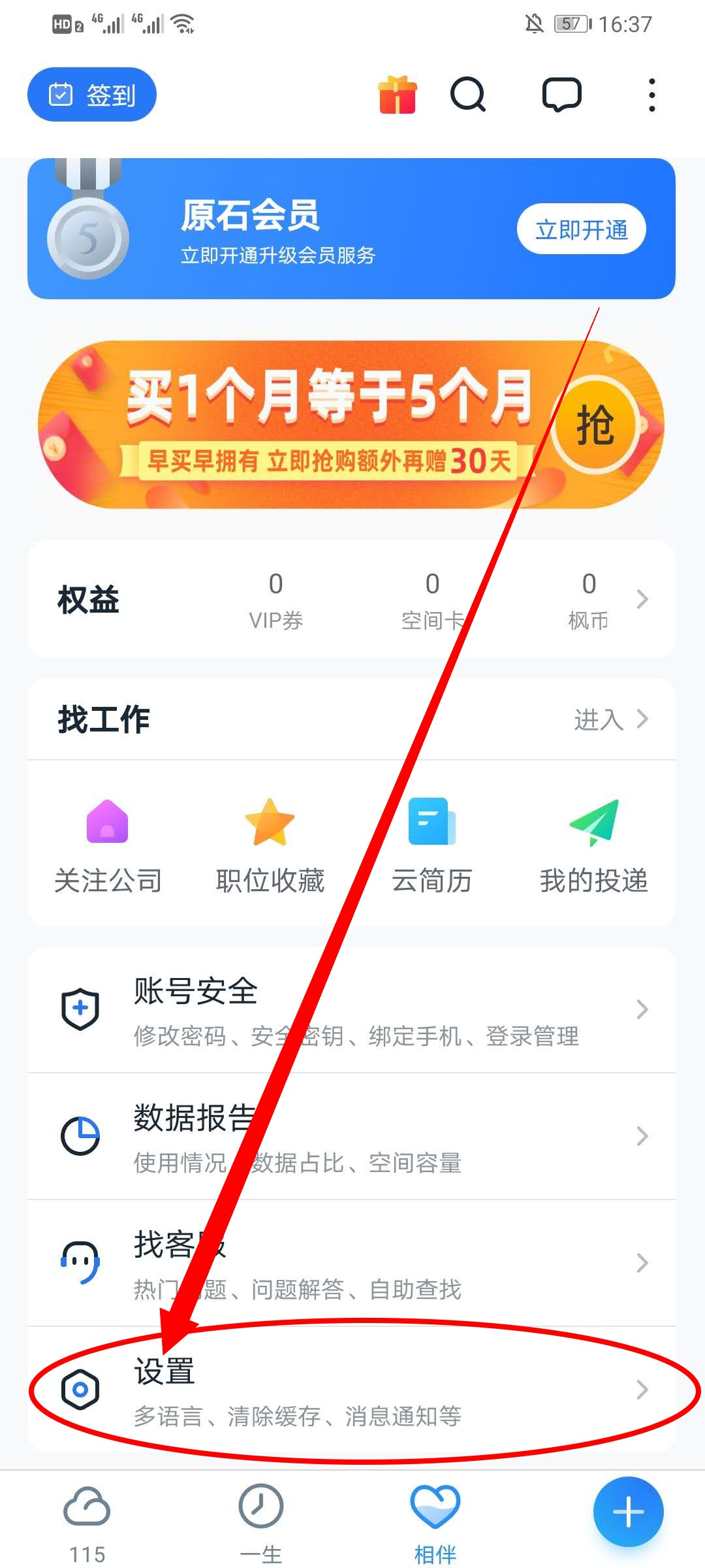 1、打开115网盘app,在首页点击下方的相伴。