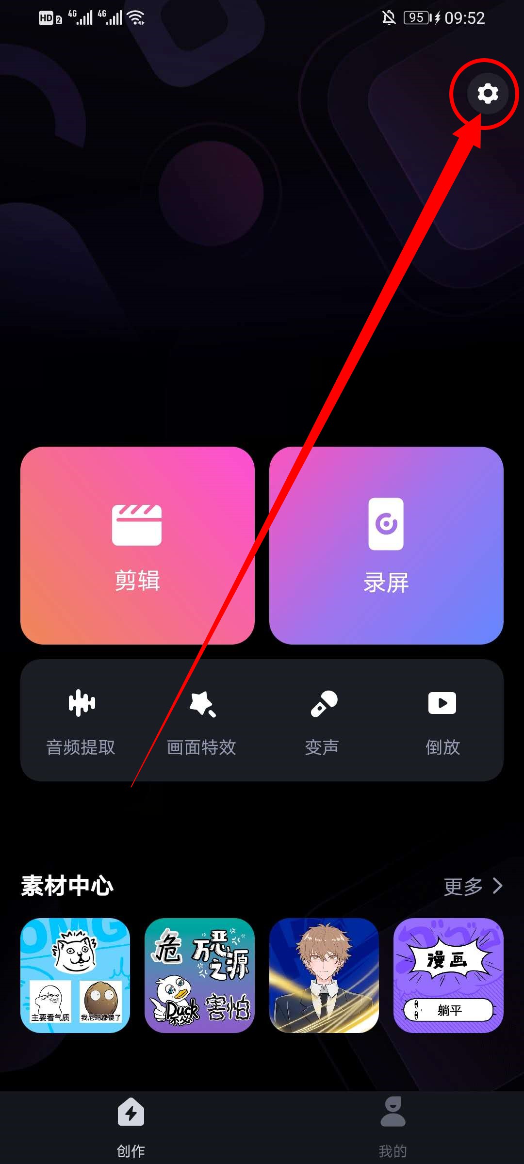 1、打开必剪App,在首页点击右上角的齿轮。