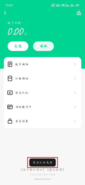 5.实名认证成功的用户,就会进入到零钱页面,会提示“实名认证成功”;