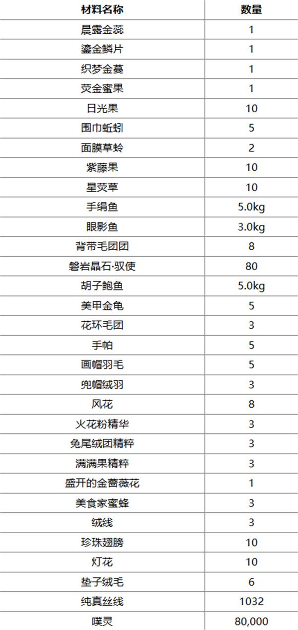 这套套装需要的材料比大部分花愿镇的其他套装更多。由于设计的精细性和制作奇迹套装所需的努力,你将需要在整个花愿镇收集各种各样的制作材料。