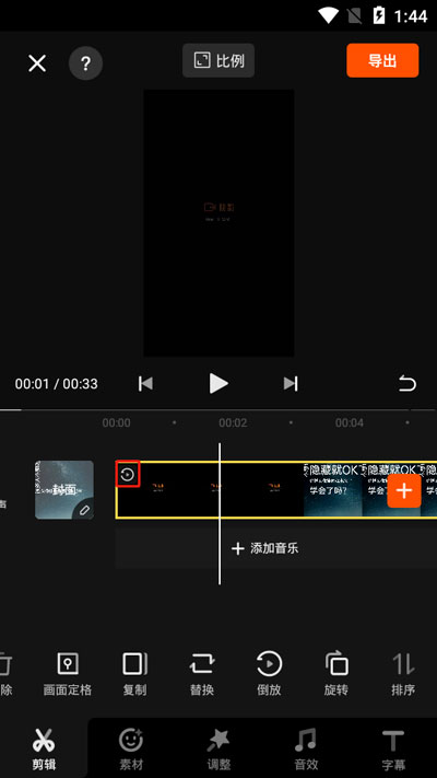 4.点击【倒放】功能之后,时间轴中的视频就会倒过来,点击【播放】就可以发现视频已经变成倒放视频了(再次点击倒放,视频就会变回原样);