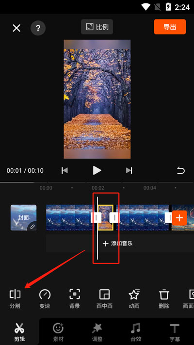 3.进入视频剪辑之后,拉动视频时间轴,找到需要删除的视频片段位置,将其拉到白色视频线下,点击【分割】;