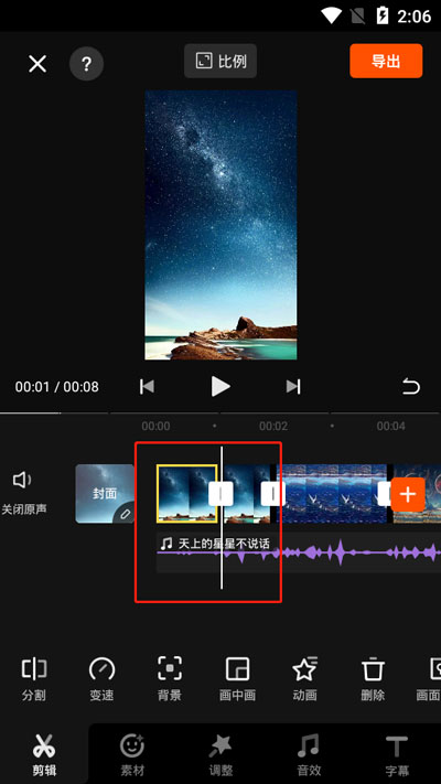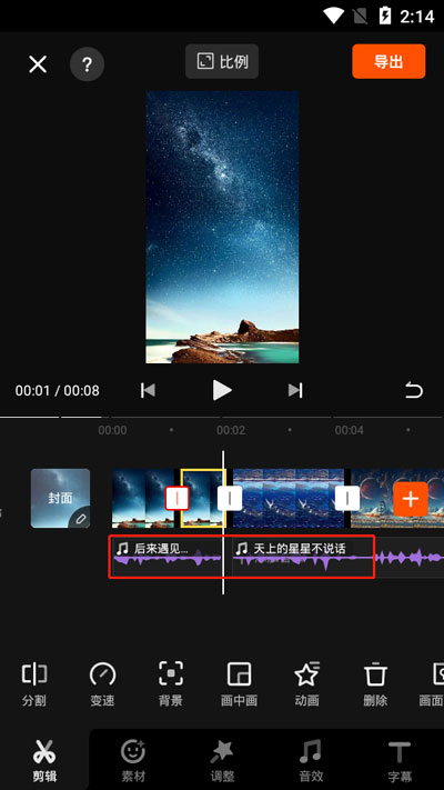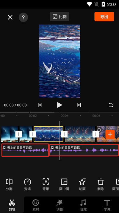 5.如果需要分割音频也是一样,拖动音频,当白色的视频条到达需要分割的位置时,音频也会被分割为两份,需要注意的是,音频在分割后会出现一点间隙,听起来会有点不自然;
