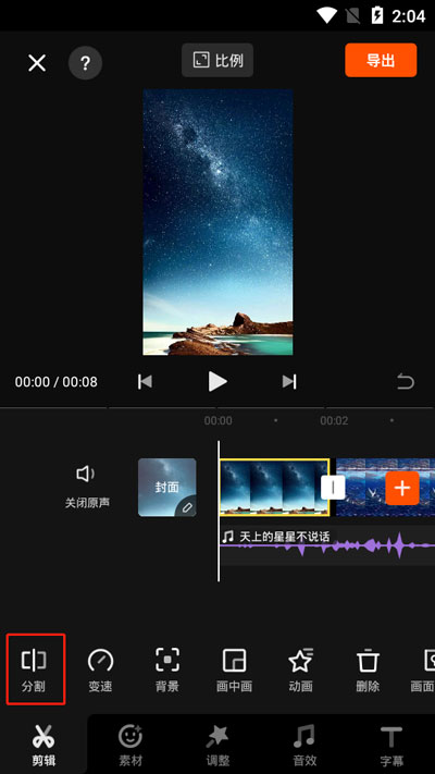 3.接着在【剪辑】中找到【分割】功能,首先我们要知道,分割的主要作用就是将合并在一起的视频、音频等分割成两个、三个、四个等多份;