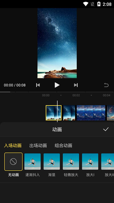 6.分割后的视频、音频片段可以进行单独的设置,例如给被分割后的视频片段添加动画效果、转场效果等等;