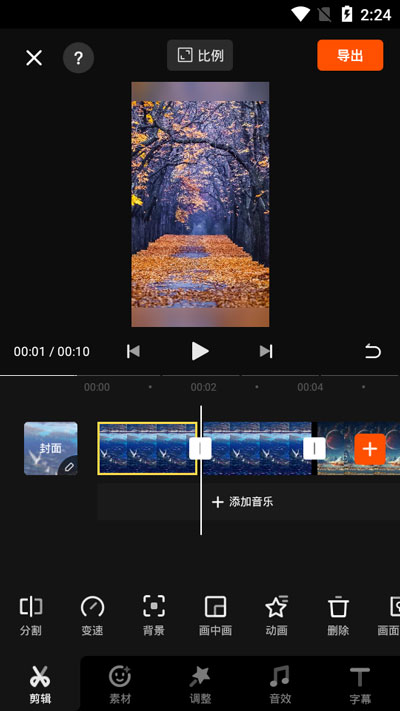 3.导入视频之后,左右拉动视频时间轴,将白色视频条的位置停留在需要分割的视频片段前、后,点击【分割】,共分割两次;