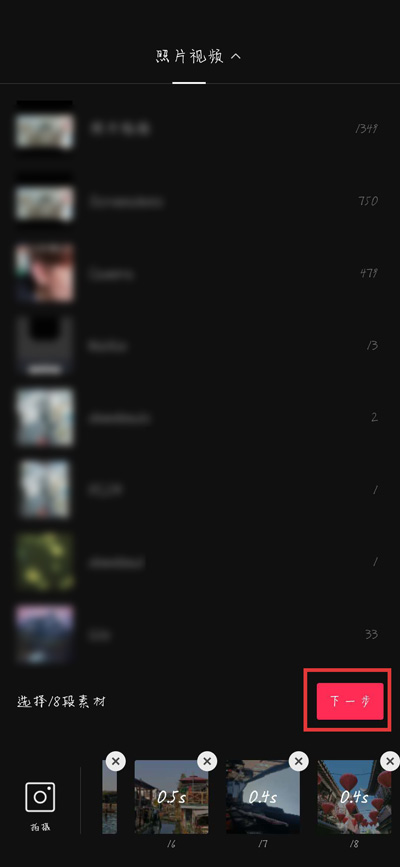 3.接着在本地相册中找到所有需要使用到的视频、图片,,点击【下一步】,注意选择的第一个视频/图片需要是闭眼的视频或者图片;