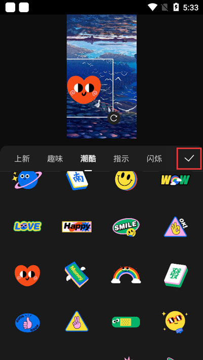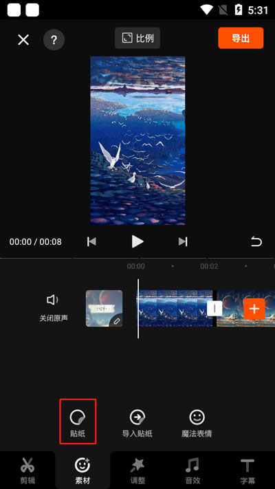 3.进入视频剪辑页面后,选择【素材】-【贴纸】,贴纸中有很多的动态贴纸、emoji、静态贴纸;